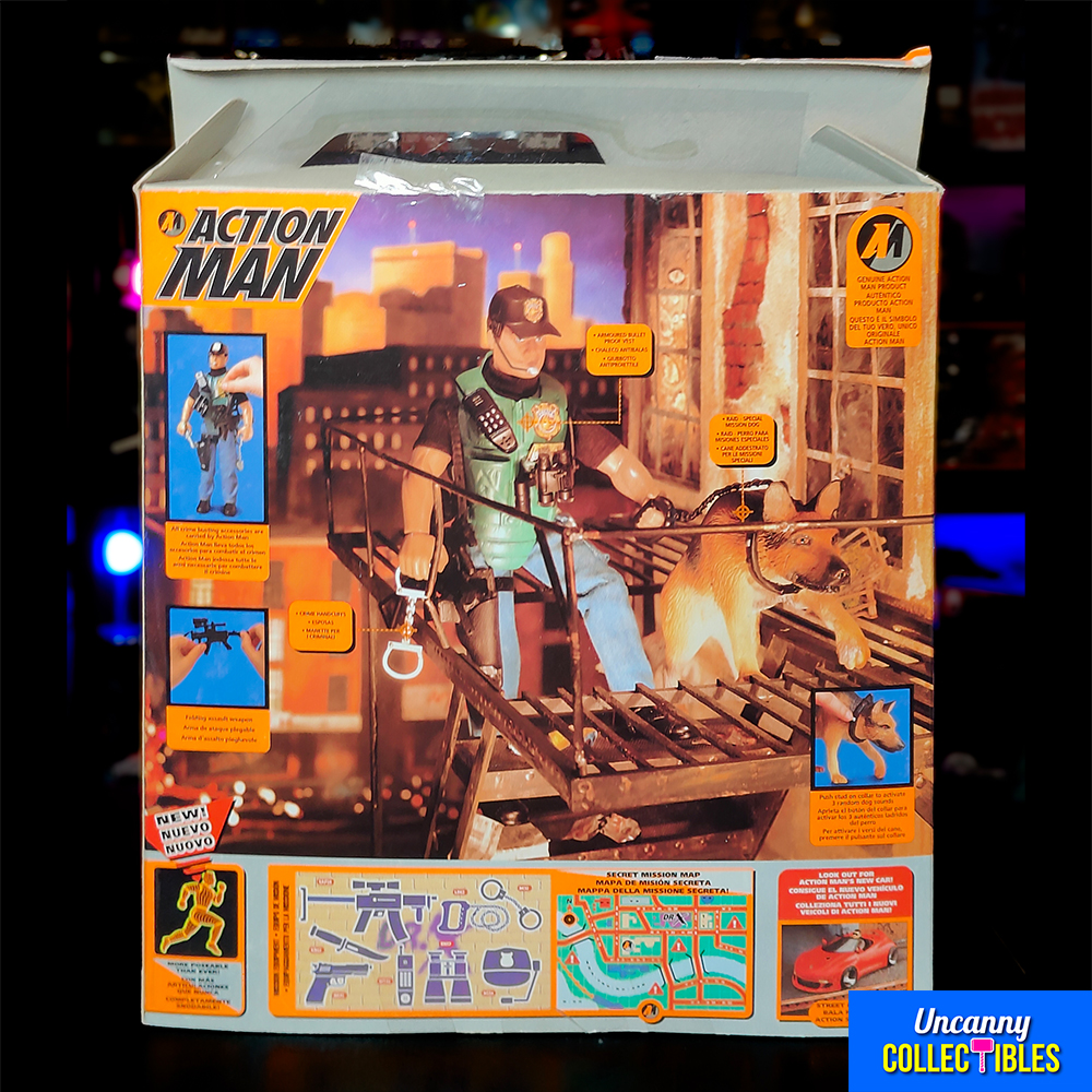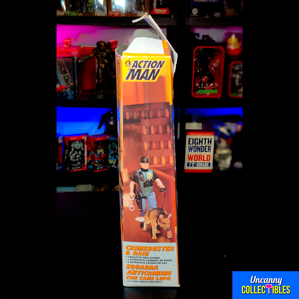 “GRRR!” This Action Man Crimebuster & Raid set from 1995 features our hero in police gear with his trusty German Shepherd. Standing 30 cm (12 inches) tall, Action Man comes with weapons and his crime-fighting canine partner. Perfect for Action Man fans and collectors of 90s toys.