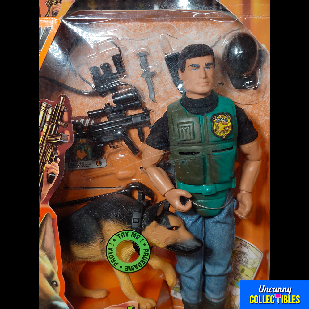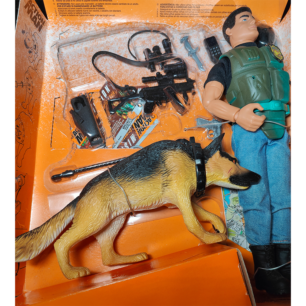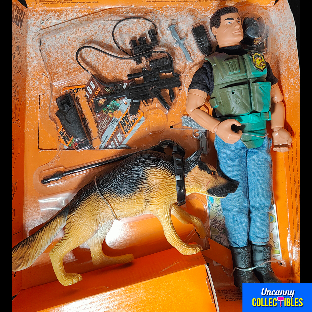 This 1995 Action Man Crimebuster comes ready to fight crime in his green tactical vest and police cap. The set includes Action Man’s loyal German Shepherd partner who helps track down the bad guys.