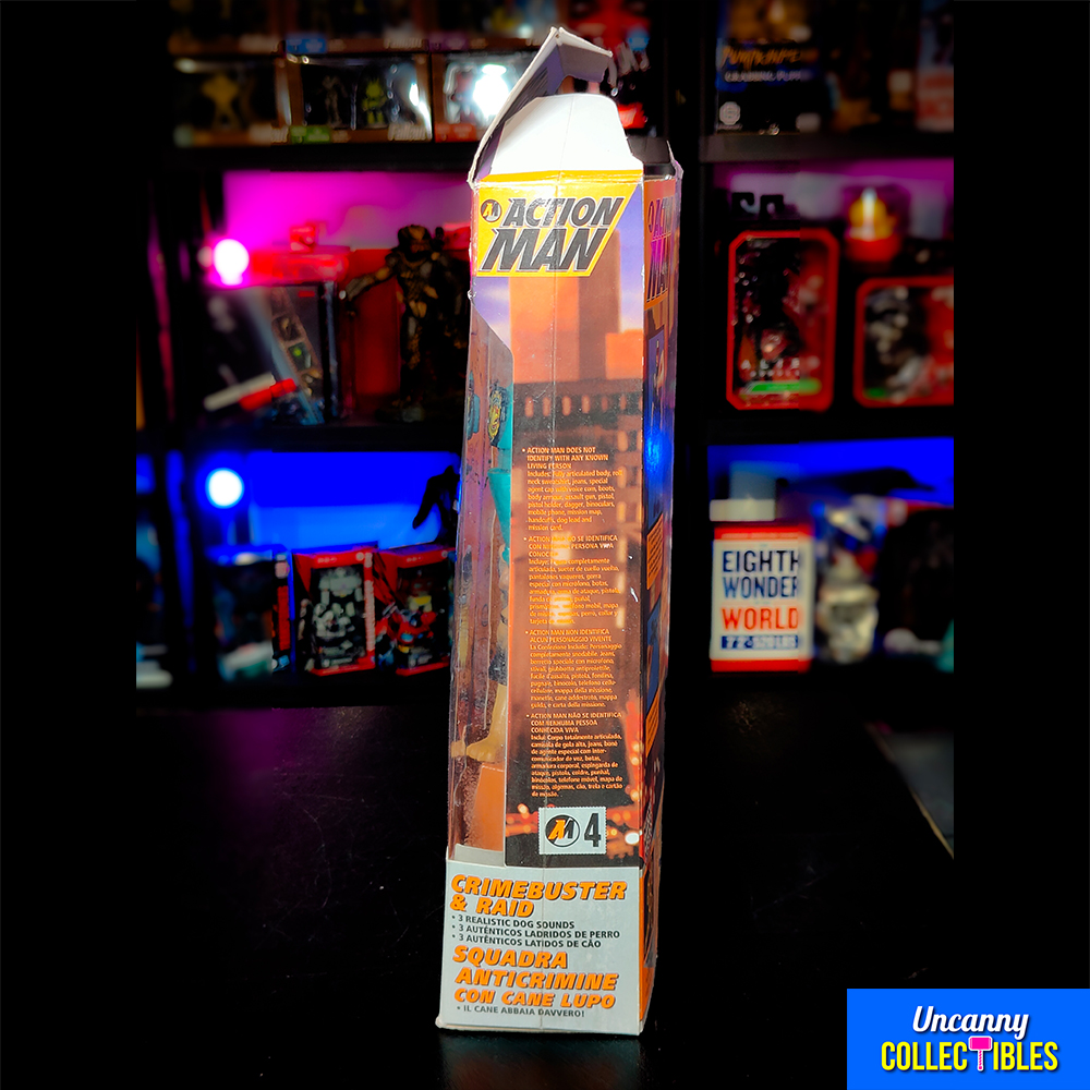 While some accessories are missing from this set, the main figure and dog are in good shape. The original box is included but shows wear from age and storage. Action Man still has his signature Eagle Eyes feature and can be posed in different action stances.