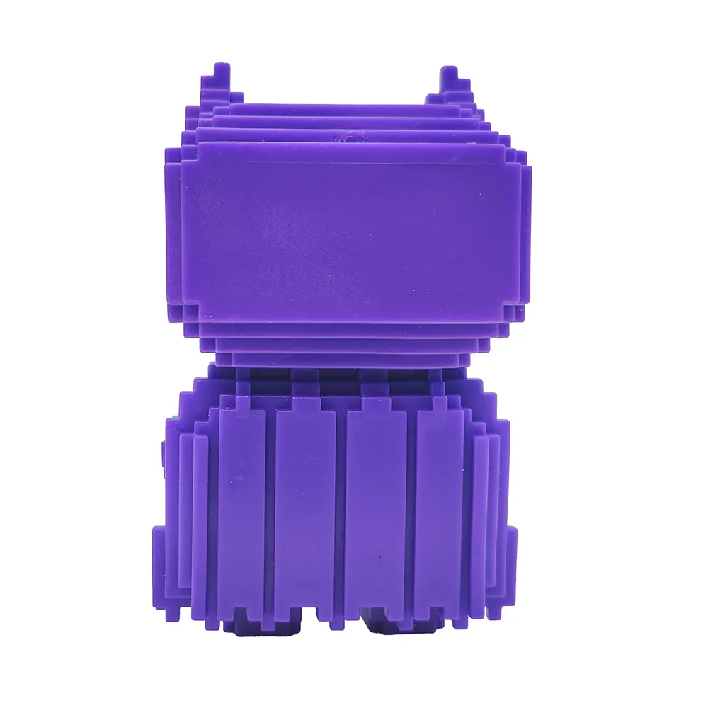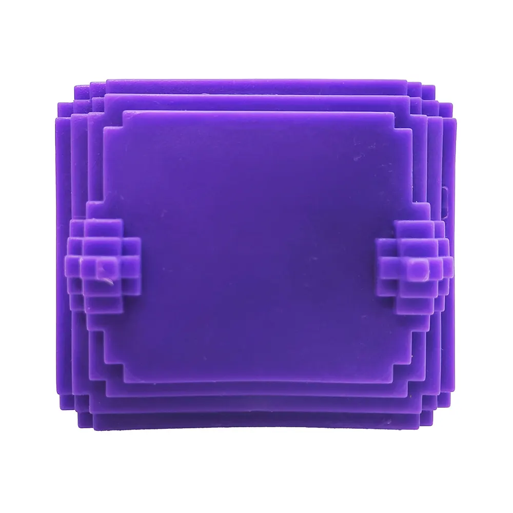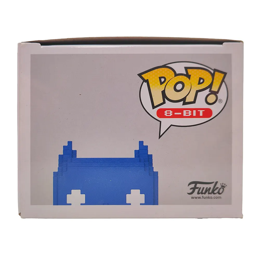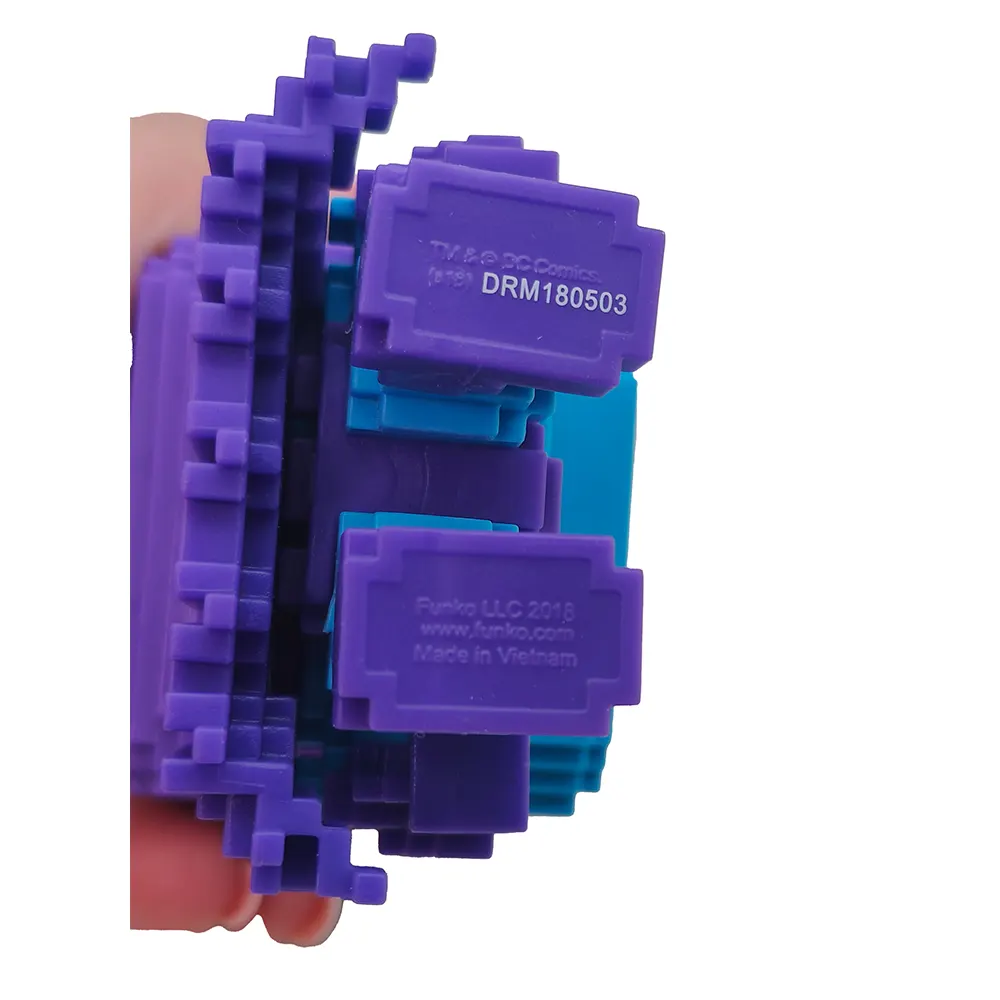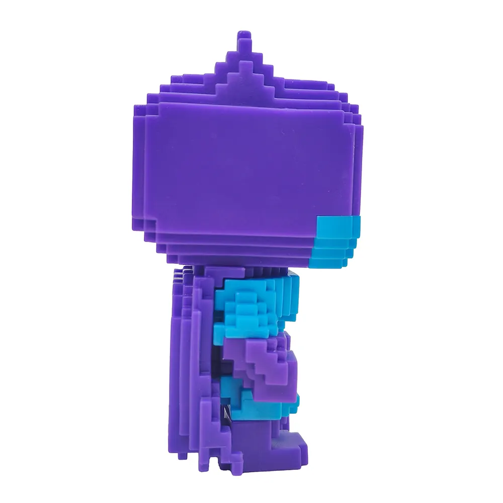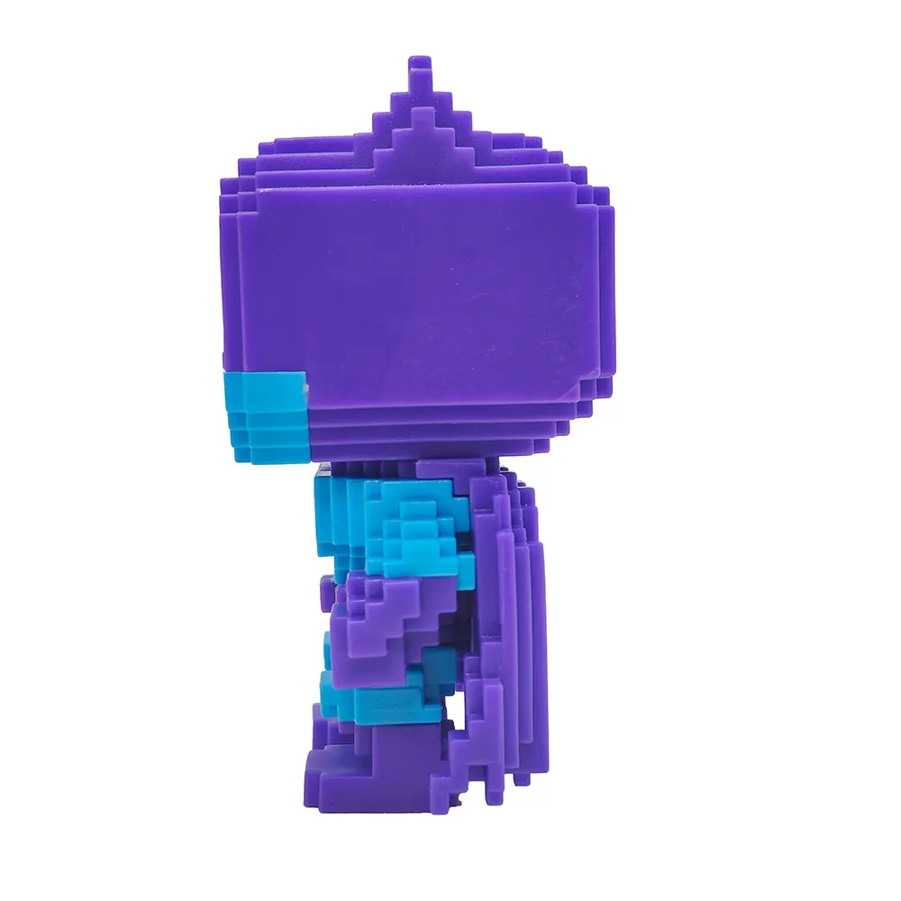 A: The entire figure is designed with a pixelated, blocky aesthetic to mimic 8-bit video game graphics, rather than the smooth, rounded design of standard Funko figures. - Q: Why is this figure blue and purple instead of black?