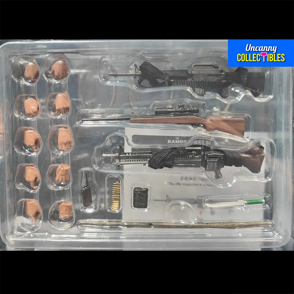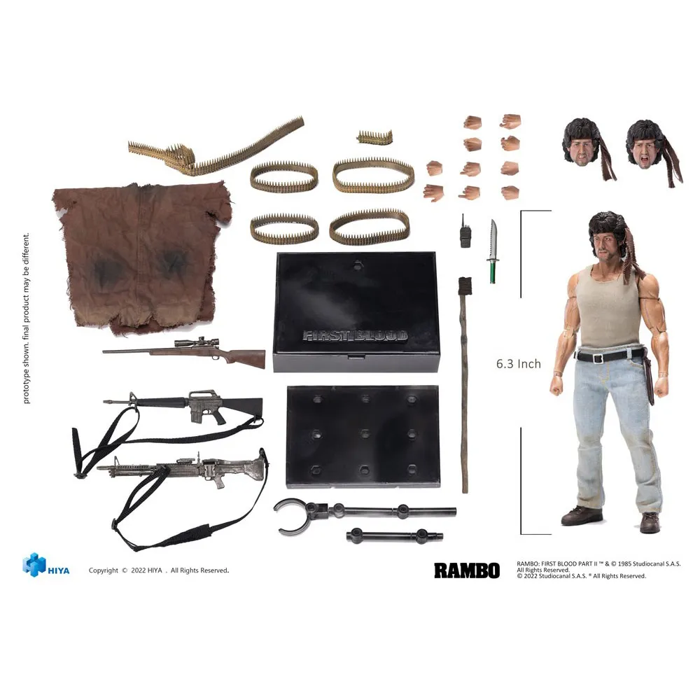 Hiya Toys presents the Rambo 1/12 scale action figure, a high-end collectible that perfectly captures every detail and shape of the iconic character. Standing 16 cm tall, this fully articulated figure features a custom-designed body with built-in joints at the neck, chest, and waist, ensuring a wide range of dynamic poses. The figure also includes six swappable hands and two interchangeable heads, allowing for diverse display options.