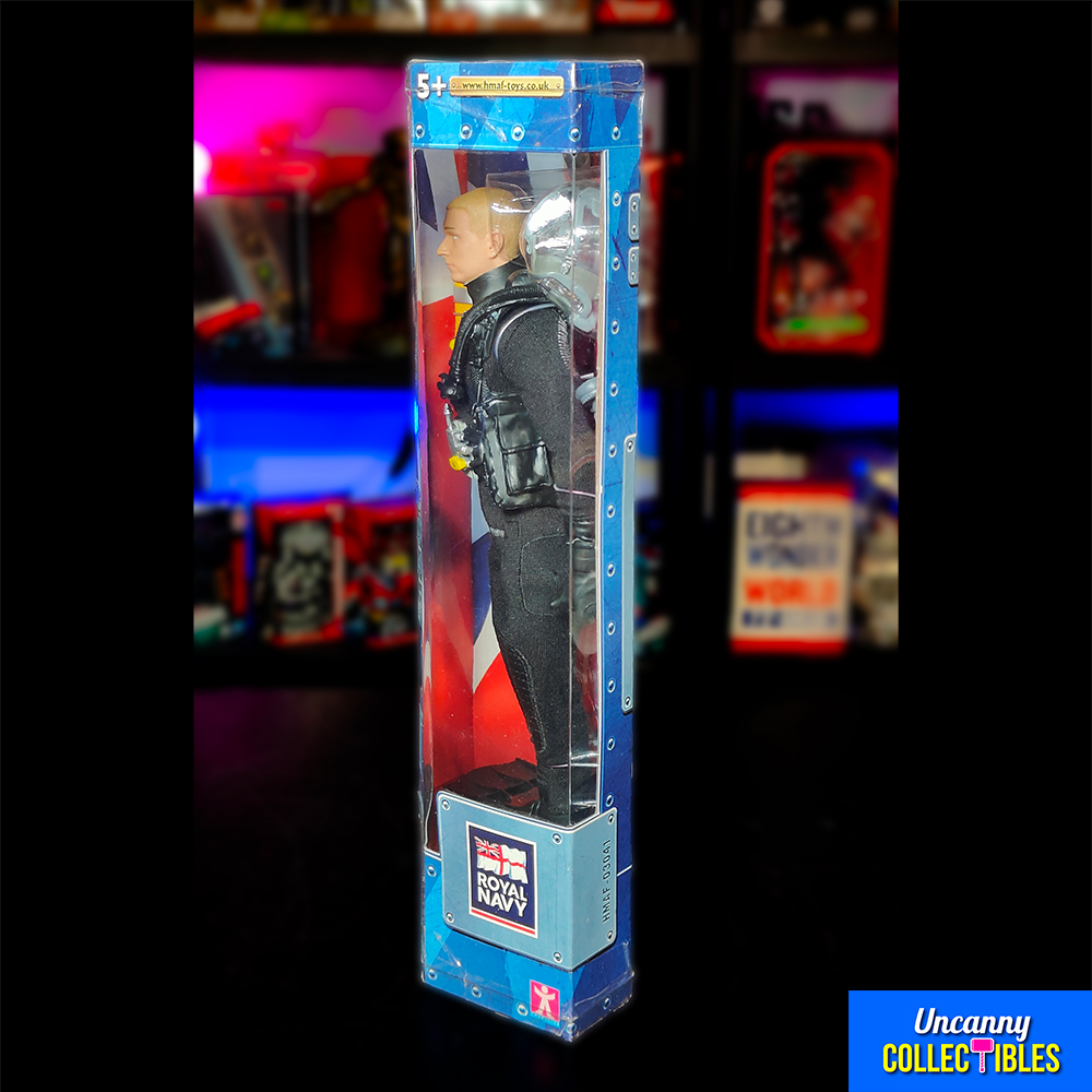 Dive into action with this HM Armed Forces Royal Navy Diver figure! Standing 30 cm (12 inches) tall, this officially licensed figure comes with a fabric diving suit, removable face mask, air tanks, and accessories. Still factory sealed in its original box, this is a great find for military action figure collectors.