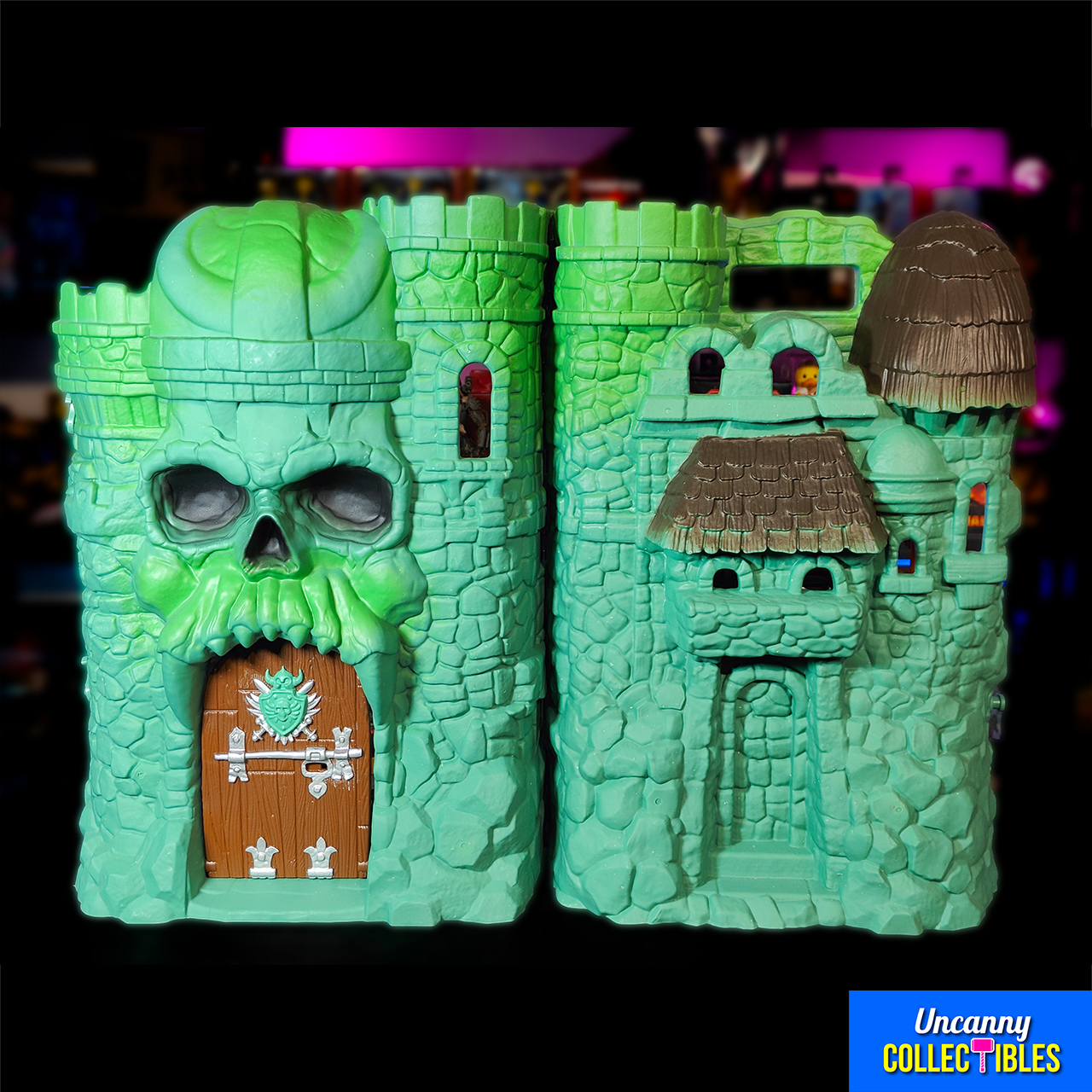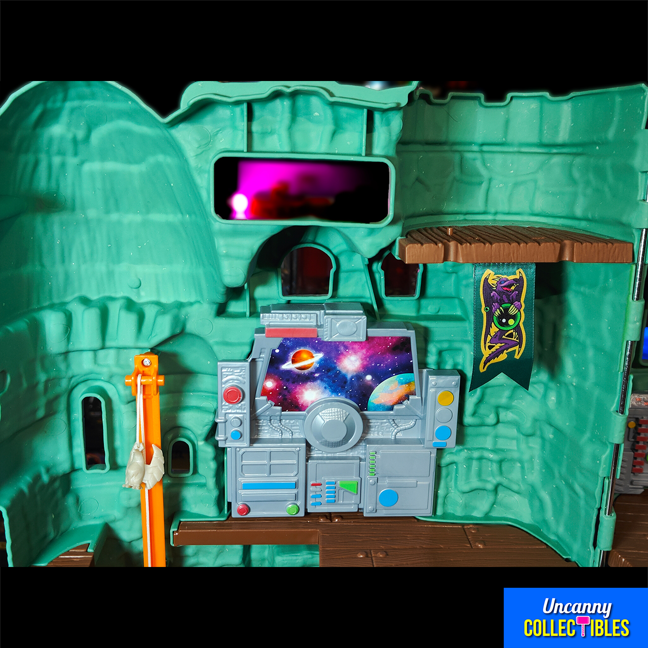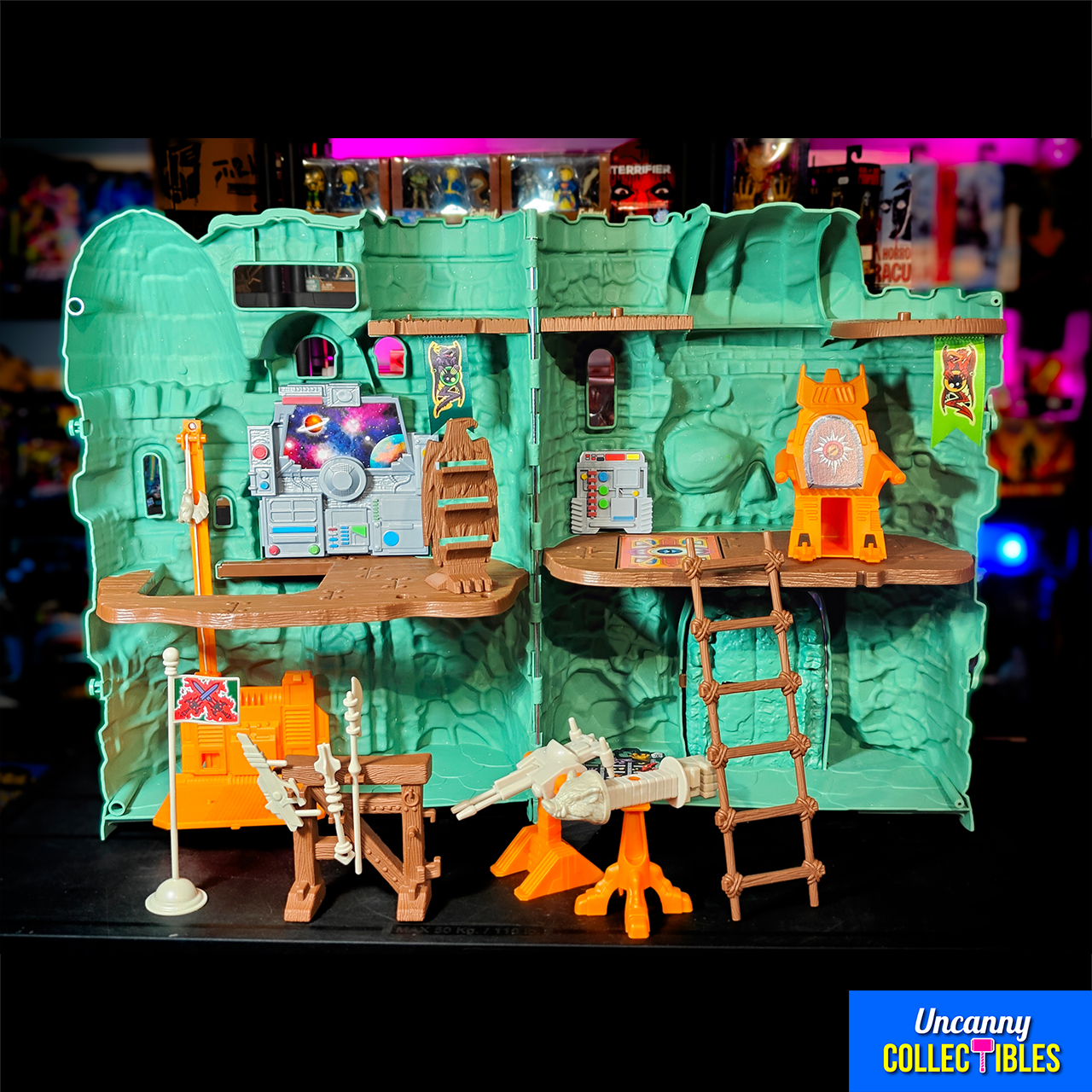 A: When fully opened, the playset is about 45 cm (18 inches) wide, giving plenty of space for displaying figures. - Q: Will vintage MOTU figures fit inside?