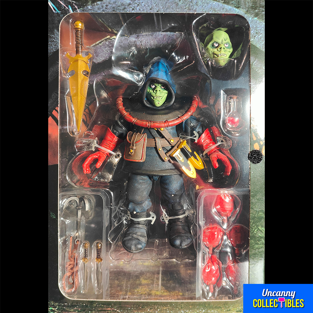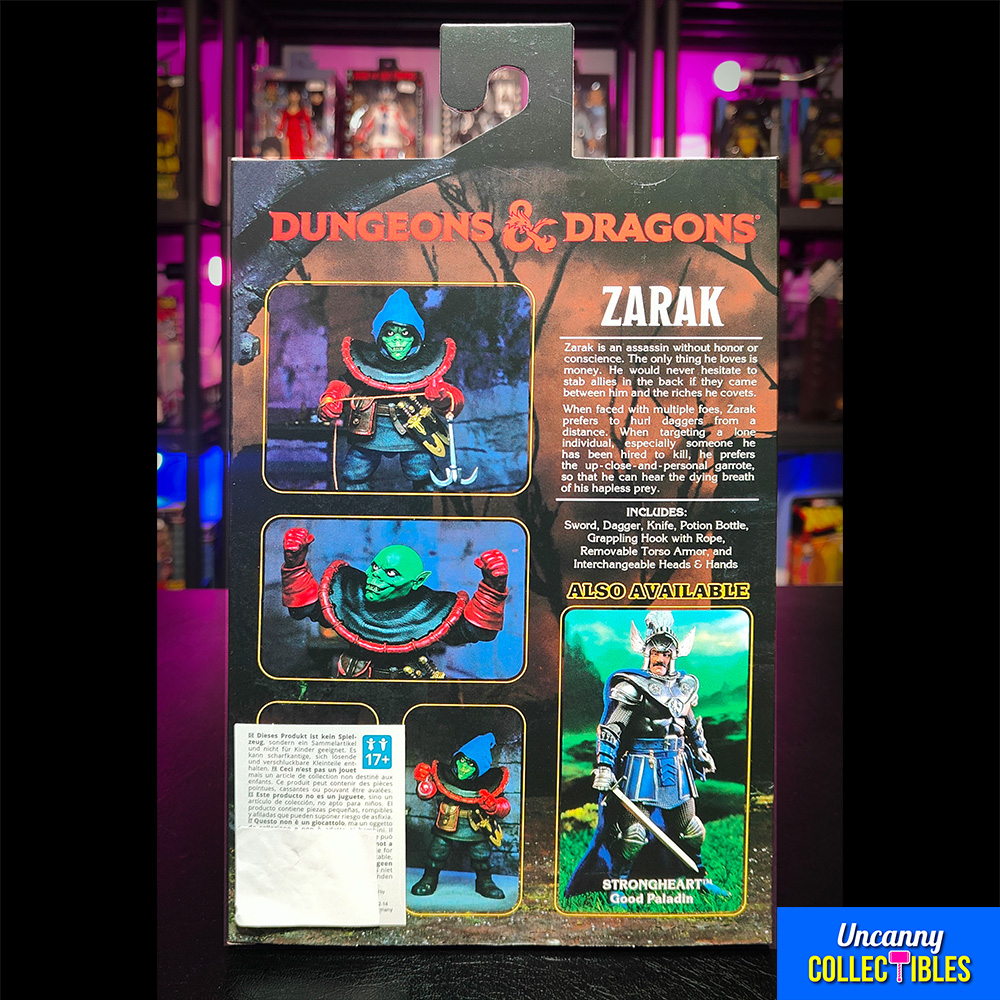 Meet Zarak, the ruthless assassin from the legendary Dungeons & Dragons game. This NECA Ultimate action figure recreates the classic character from the 1980s, with details and accessories based on the original design. This awesome figure features tailored fabric clothing, interchangeable heads and hands, sword, daggers, potion bottle, grappling hook with rope, and a collector-friendly window box packaging with an opening flap.