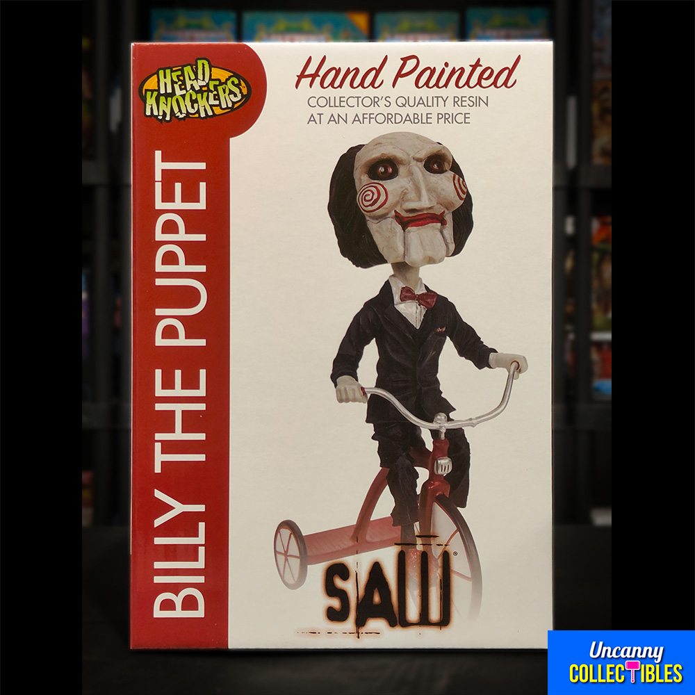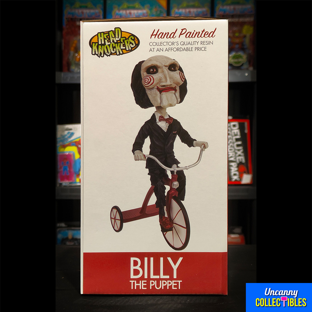 Billy is back! Returning to NECA’s popular Head Knockers line is the iconic puppet from Saw. The horror movie series uses this tricycling terror to great effect, but here his bobbling head makes him almost cute. Almost. Made of hand-painted resin, this Head Knocker is 8″ tall and comes in collectible matte finish packaging with spot gloss.