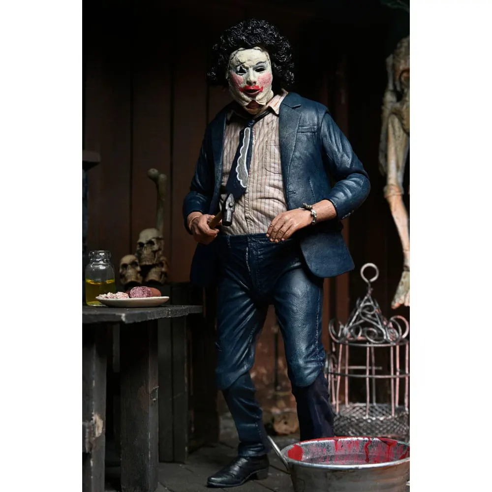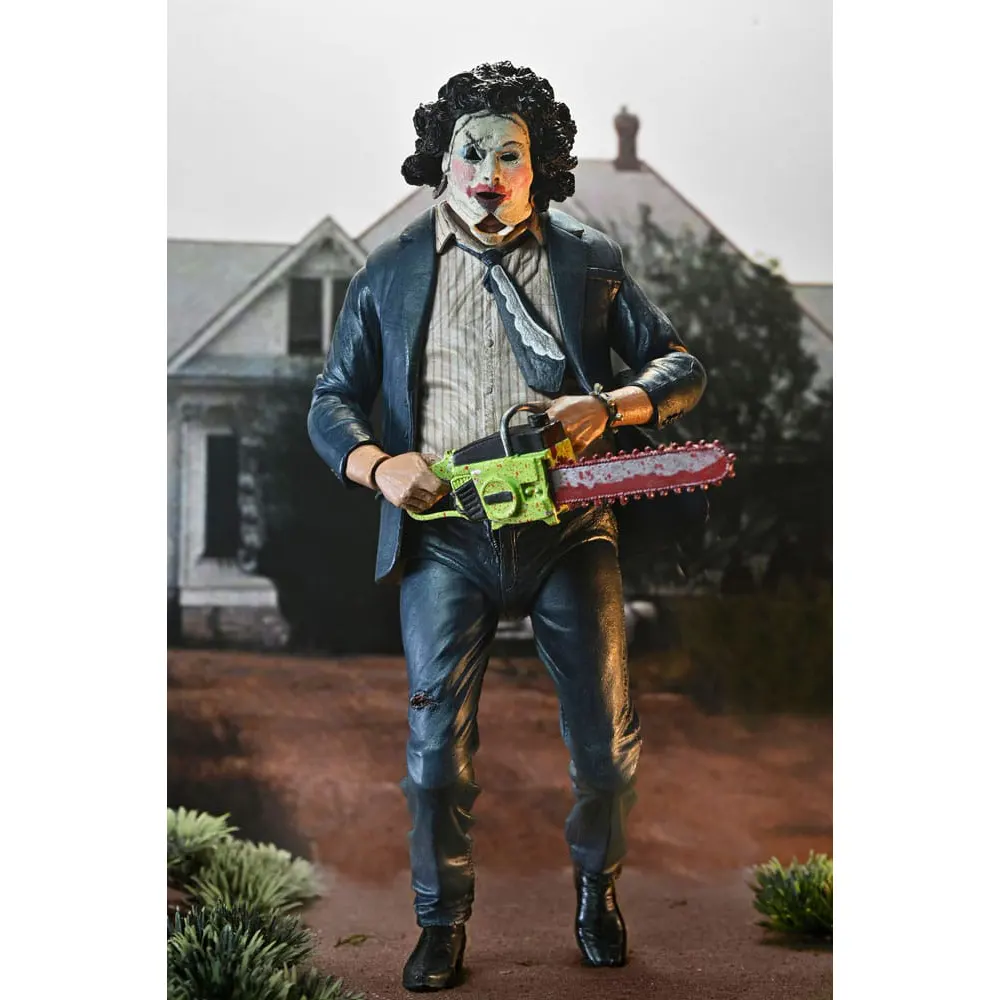 A: The tie is a separate piece that can be posed in different positions, adding another level of movement for dynamic displays, especially when using the windswept jacket option. - Q: How does this 50th Anniversary version differ from previous NECA Leatherface figures?
