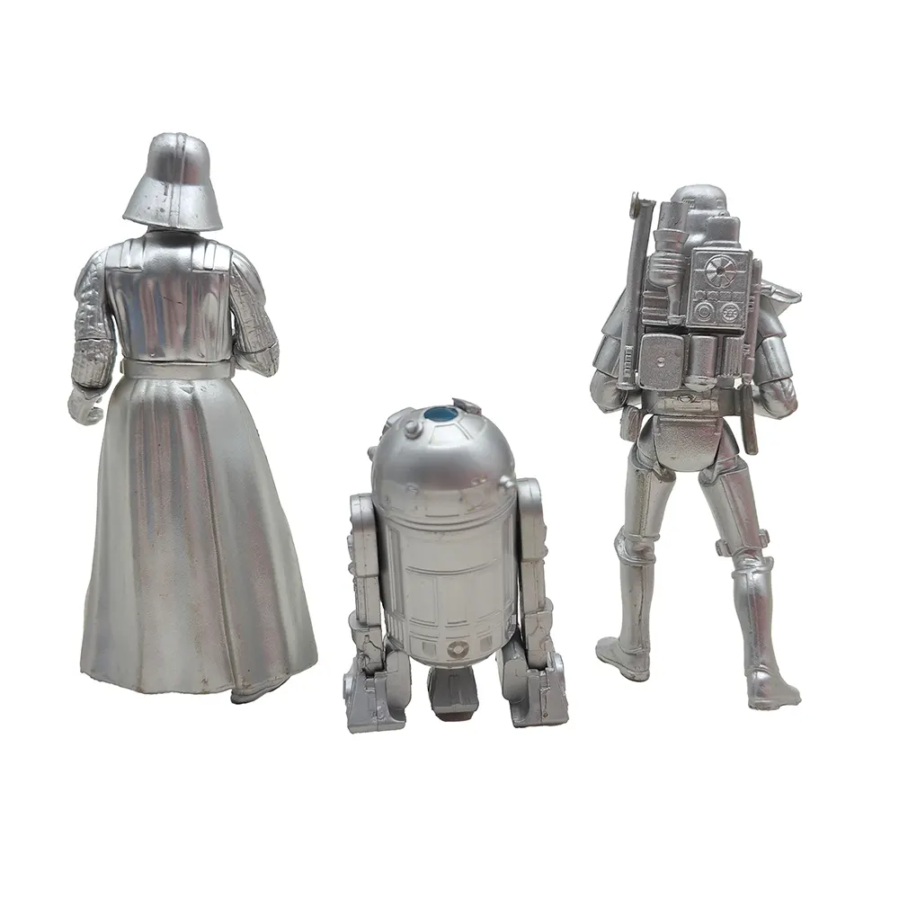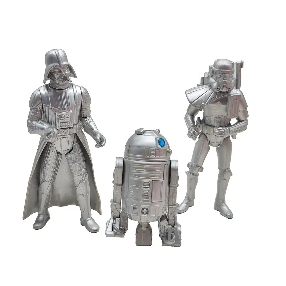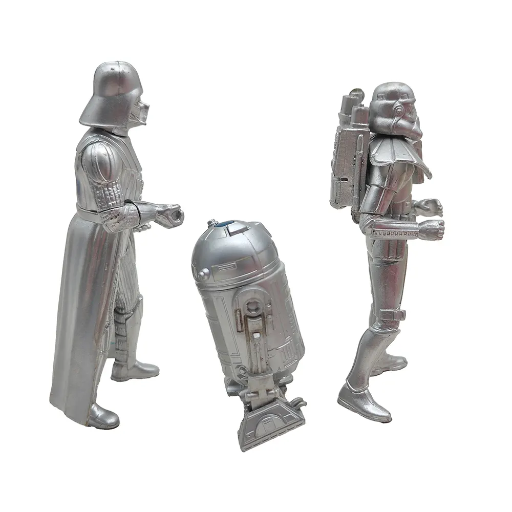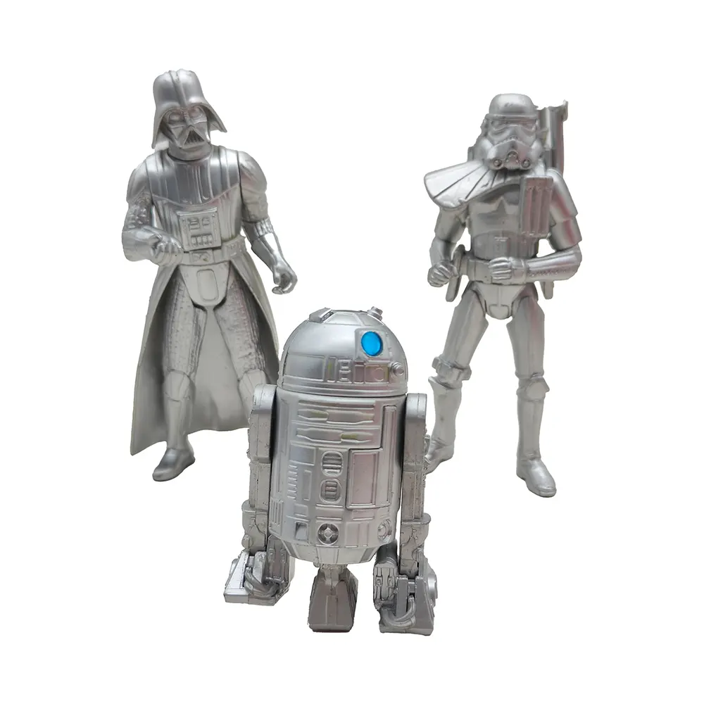 These special edition silver chrome figures from the early Hasbro Star Wars line offer a unique twist on three of the saga’s most famous characters! The Darth Vader figure (dated 1999 on the foot) captures the Dark Lord in his full imposing stance, with cape and detailed armour rendered in gleaming silver. The Sandtrooper (from 2000) stands ready for desert patrol with his signature pauldron and backpack, while R2-D2 rounds out the trio with his dome head and blue sensor adding a splash of colour to the silver droid.