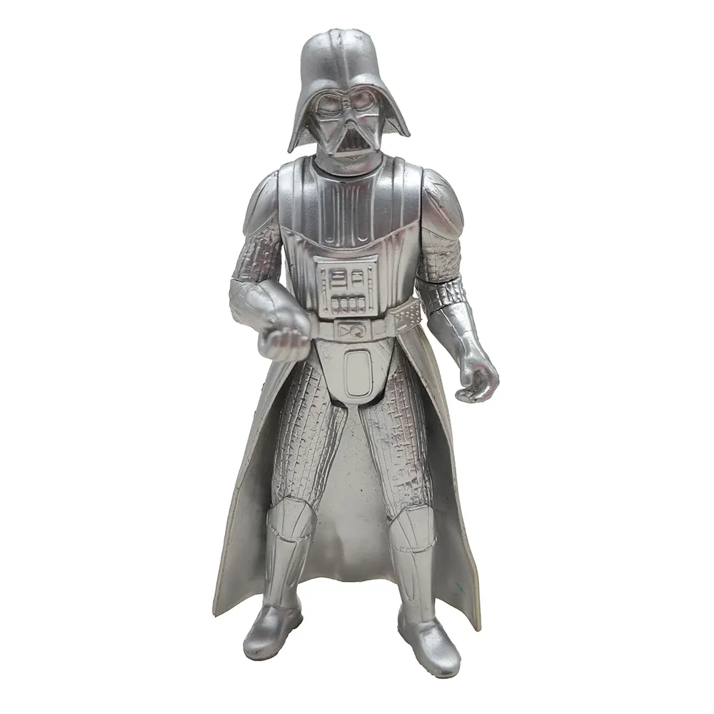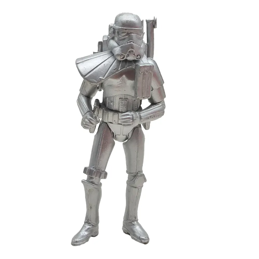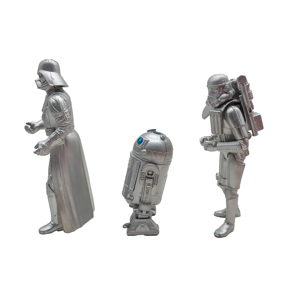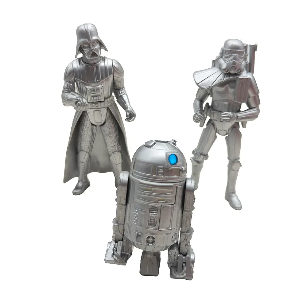 These special edition silver chrome figures from the early Hasbro Star Wars line offer a unique twist on three of the saga’s most famous characters! The Darth Vader figure (dated 1999 on the foot) captures the Dark Lord in his full imposing stance, with cape and detailed armour rendered in gleaming silver. The Sandtrooper (from 2000) stands ready for desert patrol with his signature pauldron and backpack, while R2-D2 rounds out the trio with his dome head and blue sensor adding a splash of colour to the silver droid.