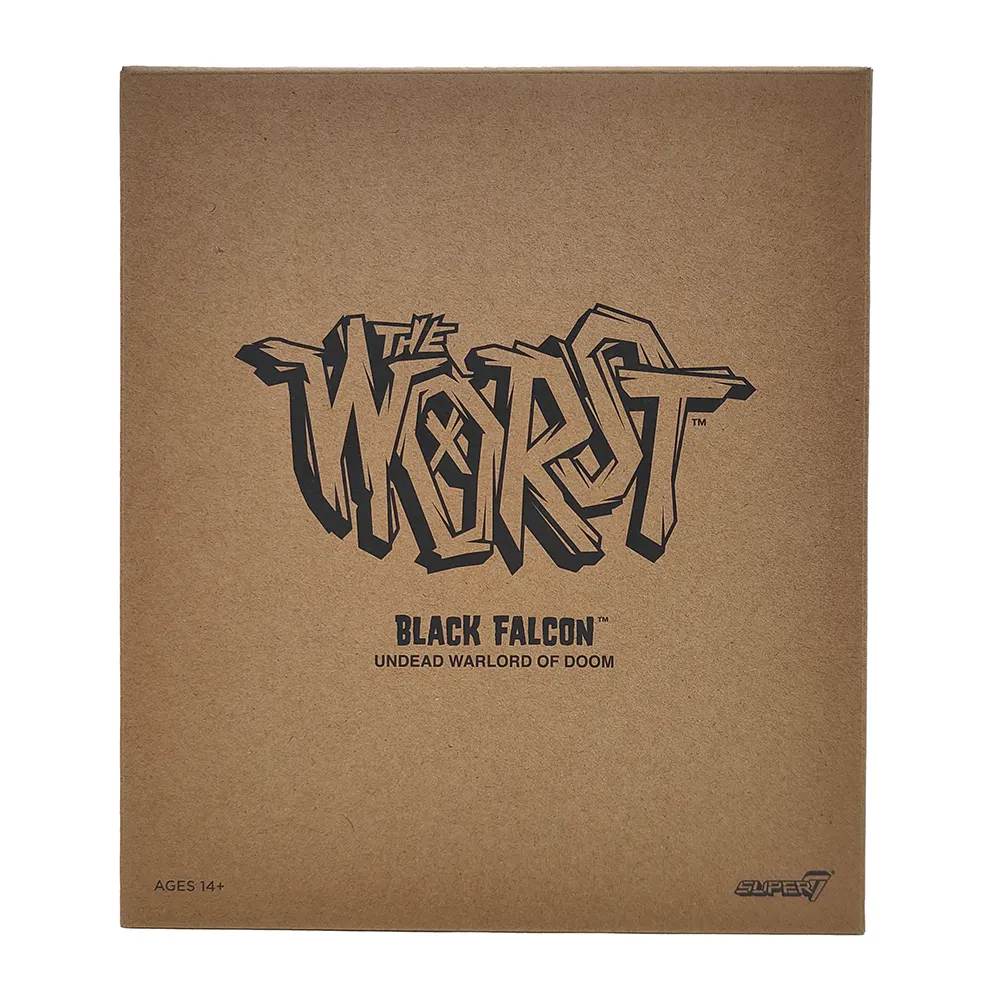 A: “The Worst” is Super7’s own line of original villains that look like they stepped out of a wild 80s cartoon that never existed! They’re Super7’s take on the most dastardly, vile, and ridiculous bad guys they could dream up. Black Falcon is the undead warrior of the bunch! - Q: Why does an undead warlord have a lunch bag?