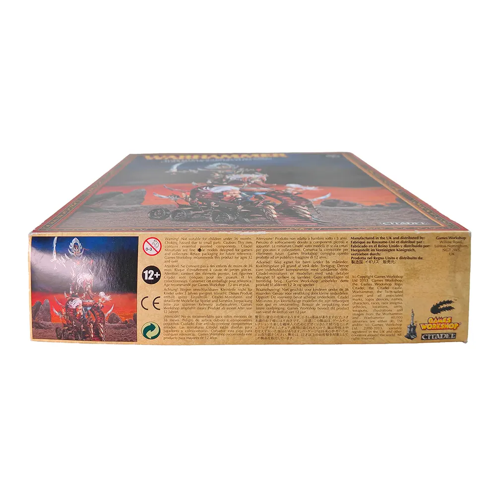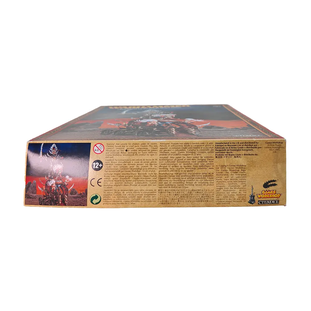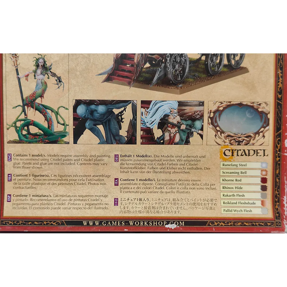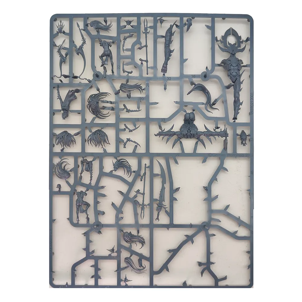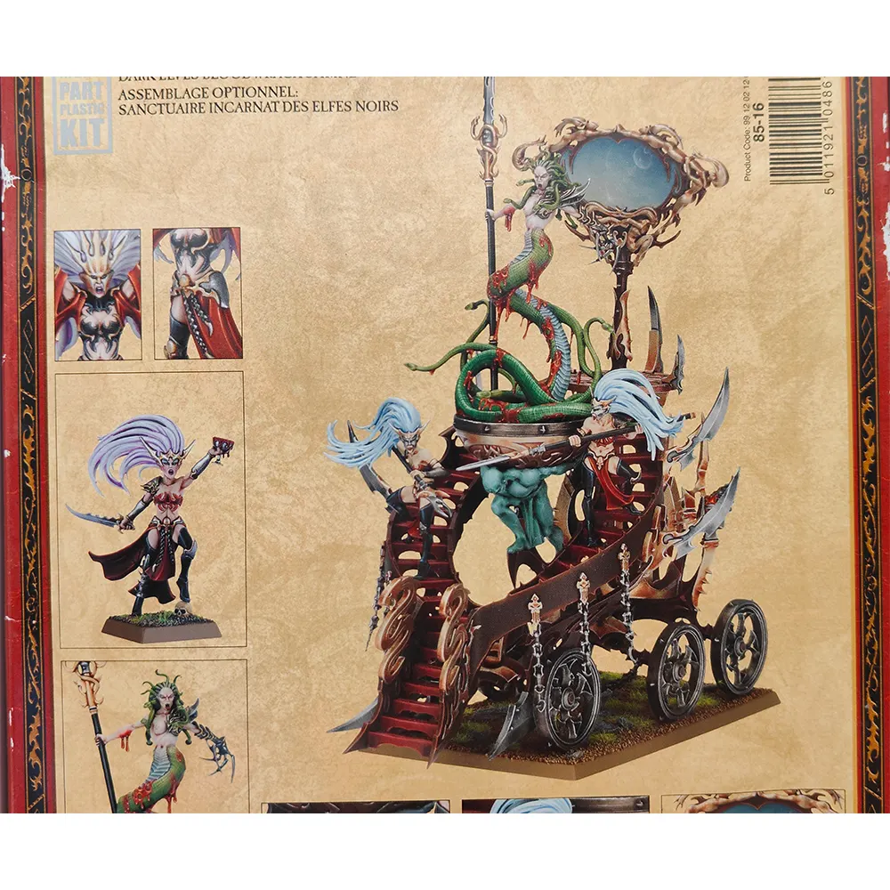 This kit is a classic example of the gothic beauty and savage elegance of the Dark Elves range, brimming with baroque details, flowing hair, blades, spikes, and mystical runes. It makes a dramatic addition to any Dark Elf force, whether displayed or used in battle to inspire your units and spread terror through enemy ranks.