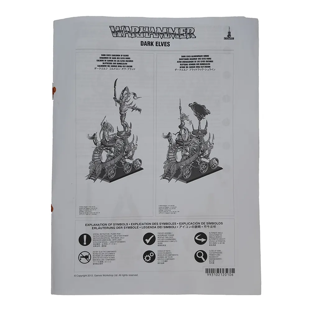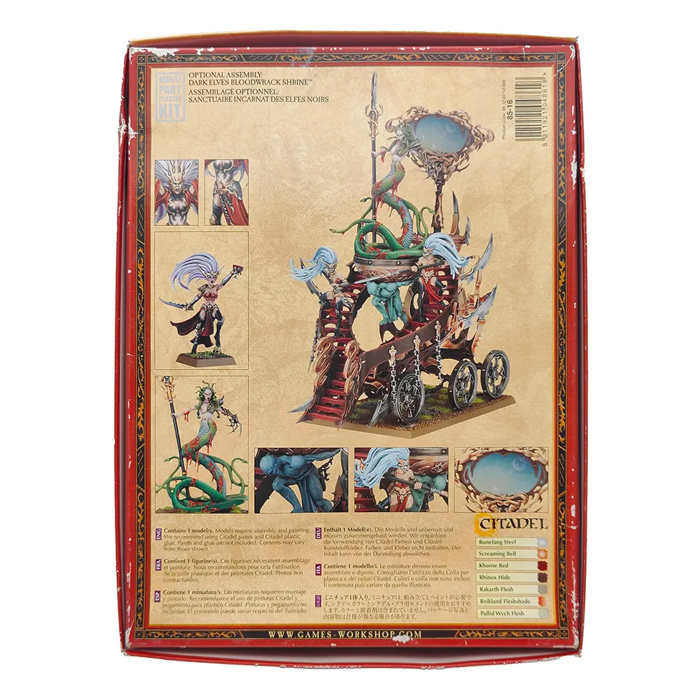 Summon the wrath of Khaine with this striking Dark Elves Cauldron of Blood from Games Workshop! This classic Warhammer Fantasy kit builds a dramatic centrepiece featuring the deadly Witch Elves, their towering shrine, and the blood-slicked cauldron itself. This set is partially assembled and unpainted, with some parts still on their original sprues and others removed or assembled. The instruction sheet is included. Please note that as this is a pre-owned item, some parts may be missing. A fantastic collector’s item or project piece for hobbyists of the Old World!
